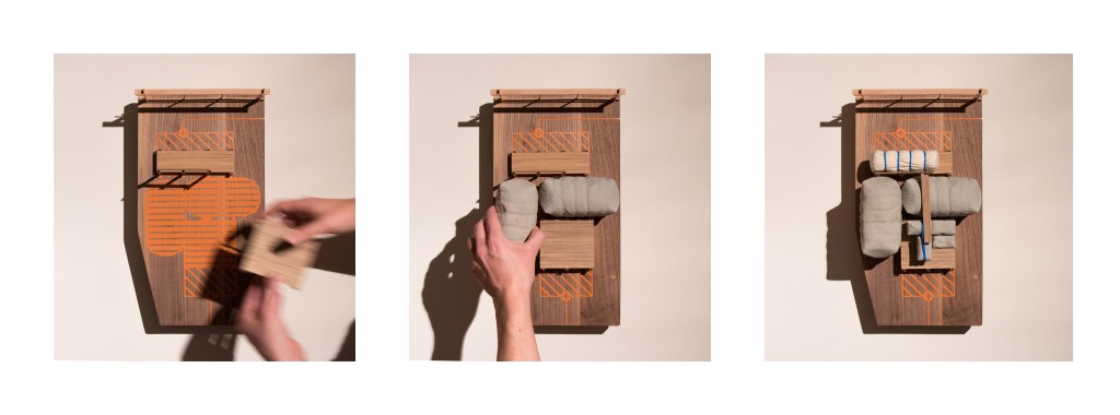 Our bench is inspired by the rich shipping history of the Royal Docks, where cargo of different sizes, textures and materials passed through daily. The playfulness of these now peculiar looking objects forms the foundation of this modular bench, which can be reconfigured into different settings for play, rest and gathering.