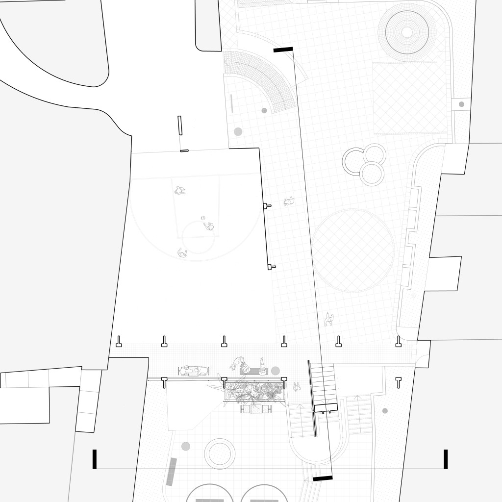 Kong. Creating a circulation framework in which miniaturised typologies of public space such as a square or a basketball court can be suspended within the narrow spaces left behind within Hong Kong’s dense urban fabric.